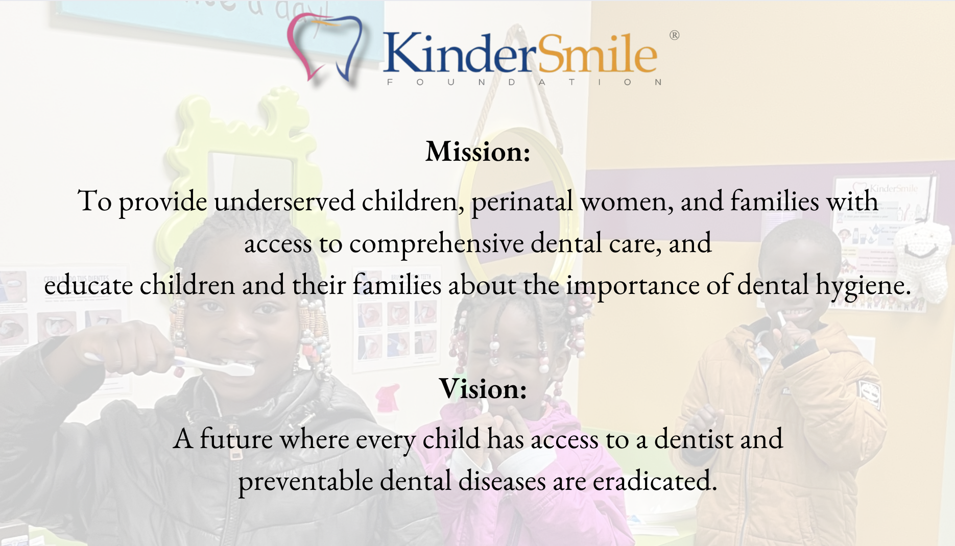 What Give Kids a Smile Day does nationally, is what we do 365 days a year through KinderSmile Foundation's mission, of providing underserved children and their families access to comprehensive dental care and educating about the importance of dental hygiene. What sets our program apart is that KinderSmile Foundation provides continuity of care through a crucial link to a brick and mortar Dental Home to all children seen on Give Kids a Smile month and always.