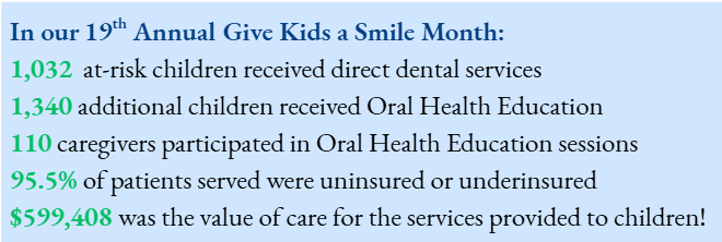 KinderSmile Foundation honored its 19th annual Give Kids a Smile event throughout the entire month of February, providing free preventive care services to all uninsured children aged 0-13.